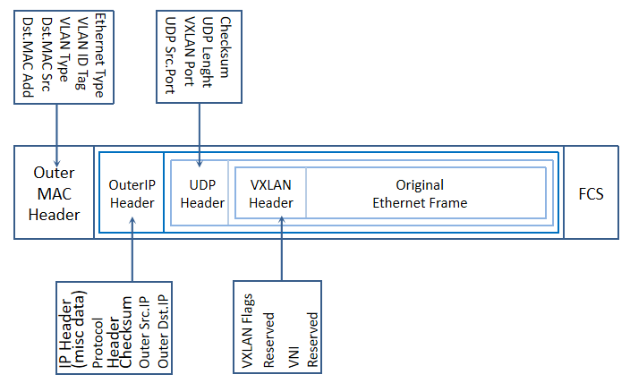 VXLAN采用MAC in UDP封装方式的一种隧道技术,通过对原始IP报文增加VXLAN报头,实现对虚拟机数据报文隔离、虚拟机动态迁移、大二层网络等需求。以下为VXLAN报文格式: