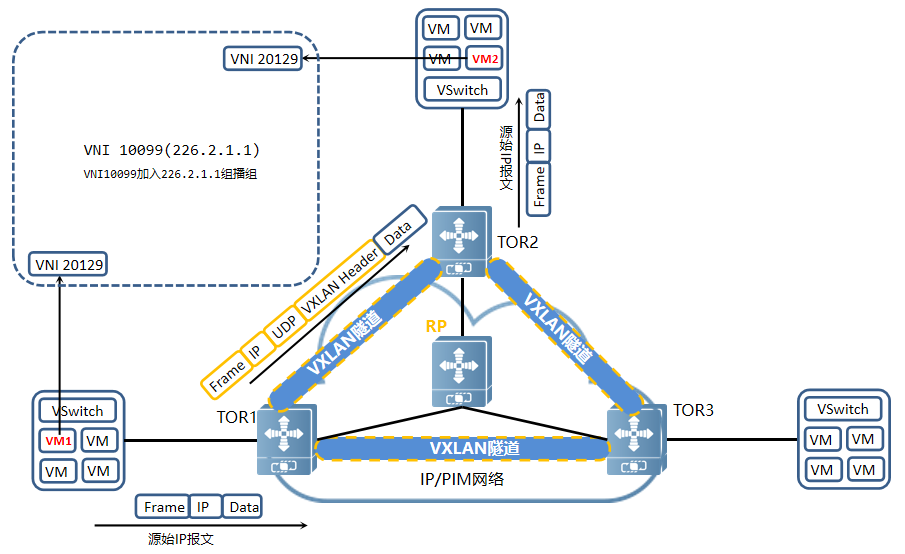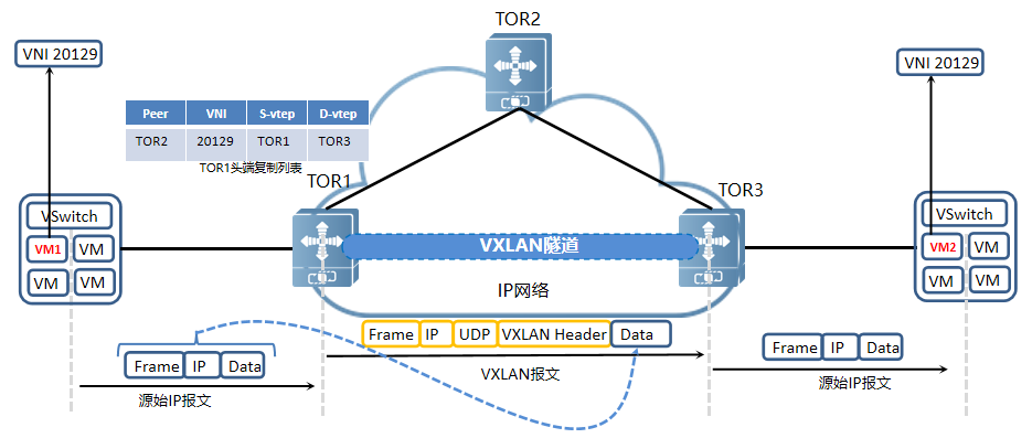 虚拟机发出的原始IP报文,到达TOR设备后增加VXLAN报头,并在VXLAN隧道进行转发,到达目标TOR设备解除VXLAN封装后得到原始IP报文,最后到达目标虚拟机。
