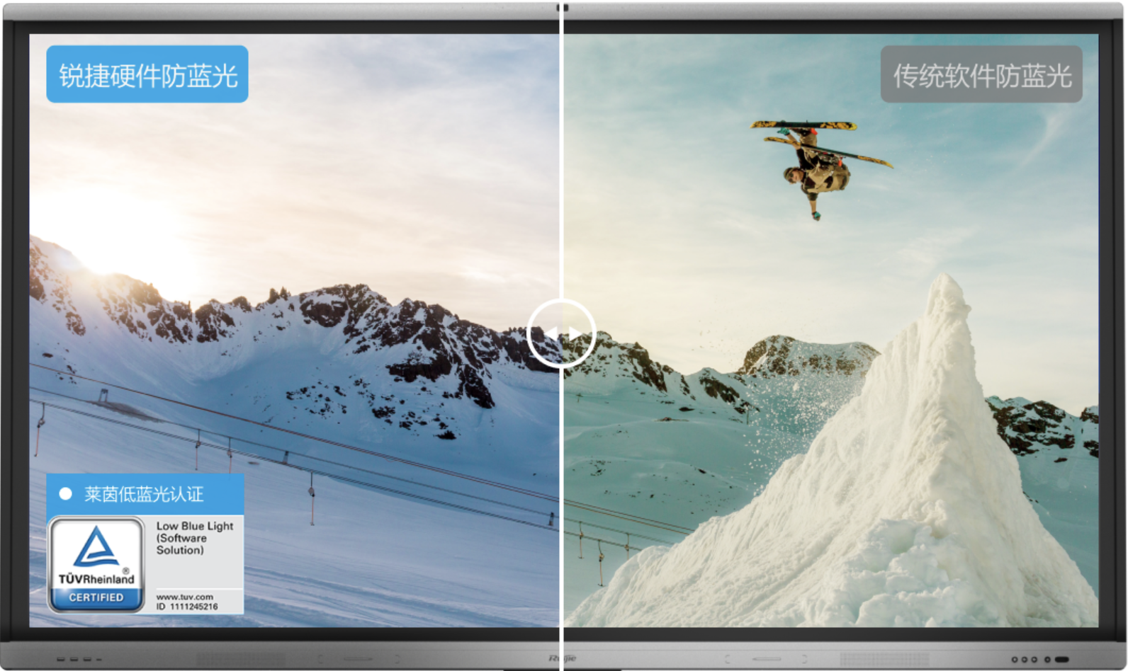 同时,新方案目前已获得莱茵低蓝光、无频闪双重安全认证。相比普通的软件调色去蓝光,尊龙时凯创新采用护眼LED背光模组,从光源实现低蓝光无频闪,在实现真正护眼的同时不影响画质。与此同时,尊龙时凯采用DC调光技术消除屏幕频闪,进一步保护师生视力健康。