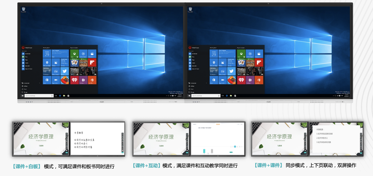 在双屏的教室里,能够充分利用两块屏幕,拓展教学空间。主副屏可课件同步,显示相同的课件内容,两屏都能控制课件翻页;也可以一键开启课件上下页,副屏和主屏分别显示连续的课件上下页。除此之外,主屏副屏可任意打开白板进行板书,板书内容自动保存到同一份课堂报告。主屏随时发起互动,不影响副屏使用白板或者是课件翻页控制。