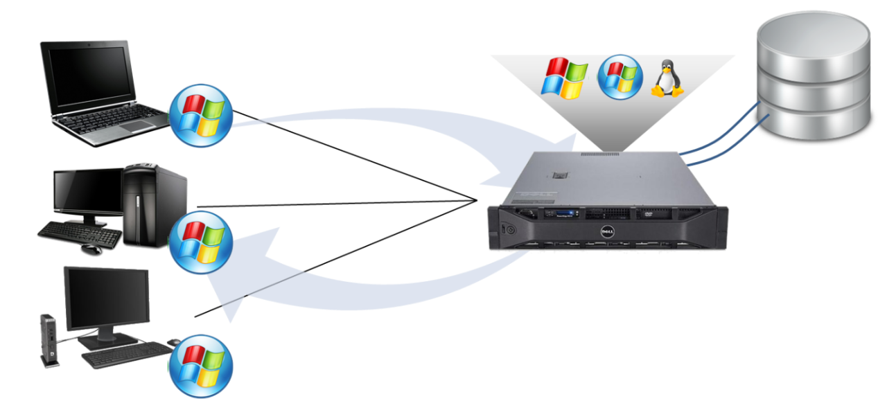 目前大多数桌面虚拟化技术均采用传统VDI架构(Virtual Desktop Infrastructure)即虚拟桌面基础架构。它实现了在数据中心服务器上通过虚拟化技术,模拟出多台桌面工作站的操作系统(如Windows 7等)。企业员工通过来自瘦客户端设备(X86或ARM架构)的图像传输协议与虚拟桌面进行连接,员工可以像操作本地桌面PC一样访问服务器上的操作系统,从而实现桌面业务的虚拟化。