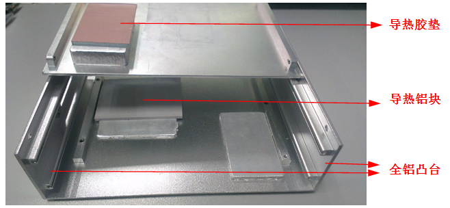 采用全铝金属凸台、全铝金属块、导热胶,将发热量较大的器件如主芯片MAC/PHY、光模块的SFP CAGE、开关电源的热量都导到机箱上。