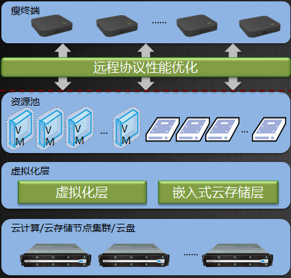 首先,IDV是分布计算、集中管理的架构思路,也用一个词来概括就是“厚端薄云”,虚拟桌面又回到了终端上运行,但跟传统PC不同的是,把服务器虚拟化的思路移植到了终端上来实现,在终端硬件和虚拟桌面之间增加了虚拟化层(hypervisor),这样使得原来PC硬件和操作系统的紧耦合状态,变成了像乐高积木一般的多层模块架构。而原来“既当爹又当妈”的服务器被解放了出来,不用再背着几十个虚拟桌面负重前行了,只需要把基础镜像(Golden Image)制作好,首次运行时把镜像下发到终端本地即可。同时用户身份、外设策略、软件分发等都可以通过终端上的虚拟化层轻松实现,这里有个专有名词叫“带外管理”。